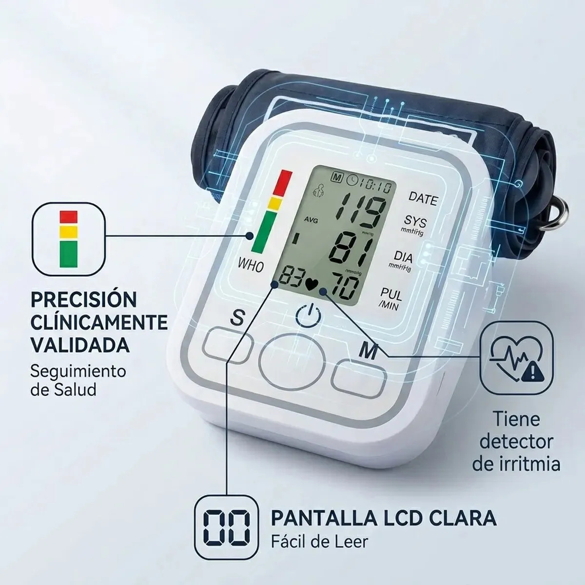 TENSIOMETRO DIGITAL DE BRAZO AUTOMATICO CON CABLE USB-C INCLUIDO Optimice el cuidado de su salud con un monitor de presion arterial de precision clinica. Este dispositivo es la herramienta ideal para quienes requieren un control diario riguroso, combinando tecnologia avanzada con una facilidad de uso excepcional. DISEÑO ERGONOMICO Y VISUALIZACION CLARA El monitor cuenta con un diseño en cuña pensado para la comodidad del usuario. Sus dimensiones de 11 cm de largo por 9 cm de ancho, con una altura que va desde los 2.5 cm en la parte baja hasta los 6 cm en la parte alta, permiten una inclinacion perfecta para visualizar la pantalla LCD sin reflejos. ALIMENTACION DUAL PARA MAYOR COMODIDAD A diferencia de otros modelos, este tensiometro incluye un cable USB tipo C de 29 cm de largo. Esto le permite utilizarlo conectado a cualquier puerto USB o cargador de pared. Tambien funciona con 4 pilas AAA (no incluidas) para que pueda llevarlo consigo en viajes o emergencias. GESTION INDEPENDIENTE DE DATOS El sistema permite almacenar los registros de 2 usuarios de manera separada. Cada medicion queda guardada con su respectiva fecha y hora, facilitando el reporte de resultados a su medico de cabecera. ESPECIFICACIONES TECNICAS: Tipo de medicion: Presion arterial y frecuencia cardiaca. Pantalla: LCD digital de facil lectura. Capacidad: 2 usuarios independientes. Dimensiones del equipo: 11 x 9 cm. Altura del equipo: 2.5 cm (minima) a 6 cm (maxima). Idioma del sistema: Ingles. Indicadores: Presion alta/baja, pulso, arritmia y bateria baja. CONTENIDO DEL PAQUETE: 1 Monitor de presion arterial digital de brazo. 1 Brazalete estandar. 1 Cable USB tipo C (29 cm).