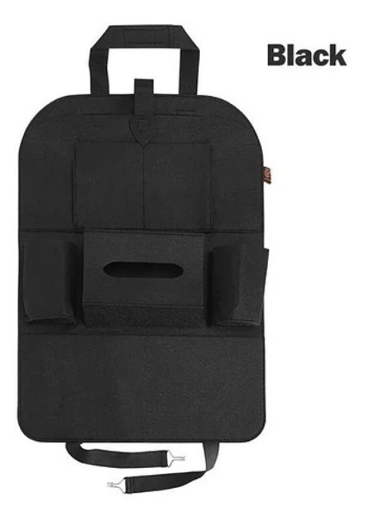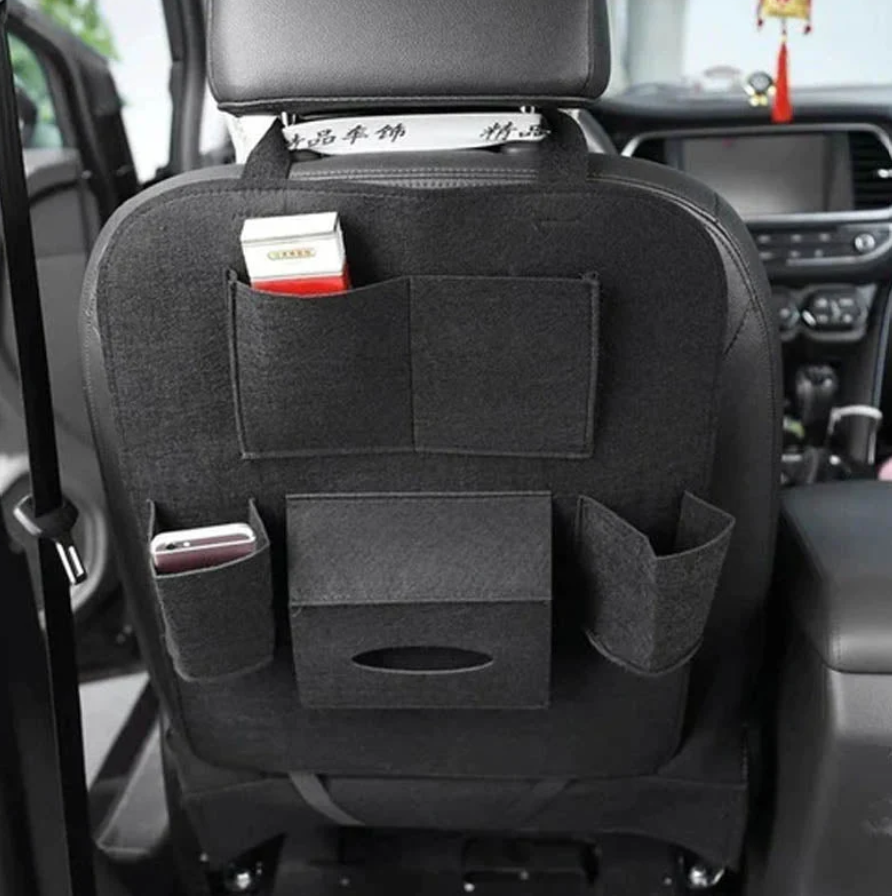 El compartimento central para pañuelos permite un acceso rápido y cómodo, mientras que los bolsillos laterales son perfectos para dispositivos pequeños o botellas. Su diseño compacto se adapta fácilmente al respaldo del asiento sin ocupar espacio adicional dentro del vehículo.
