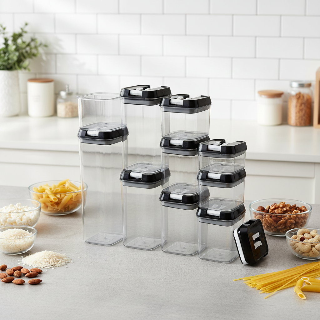 Mantén tu cocina ordenada, fresca y elegante con este set de 7 contenedores herméticos, ideales para almacenar alimentos secos de forma segura y práctica. Perfectos para transformar tu despensa en un espacio limpio y organizado.
